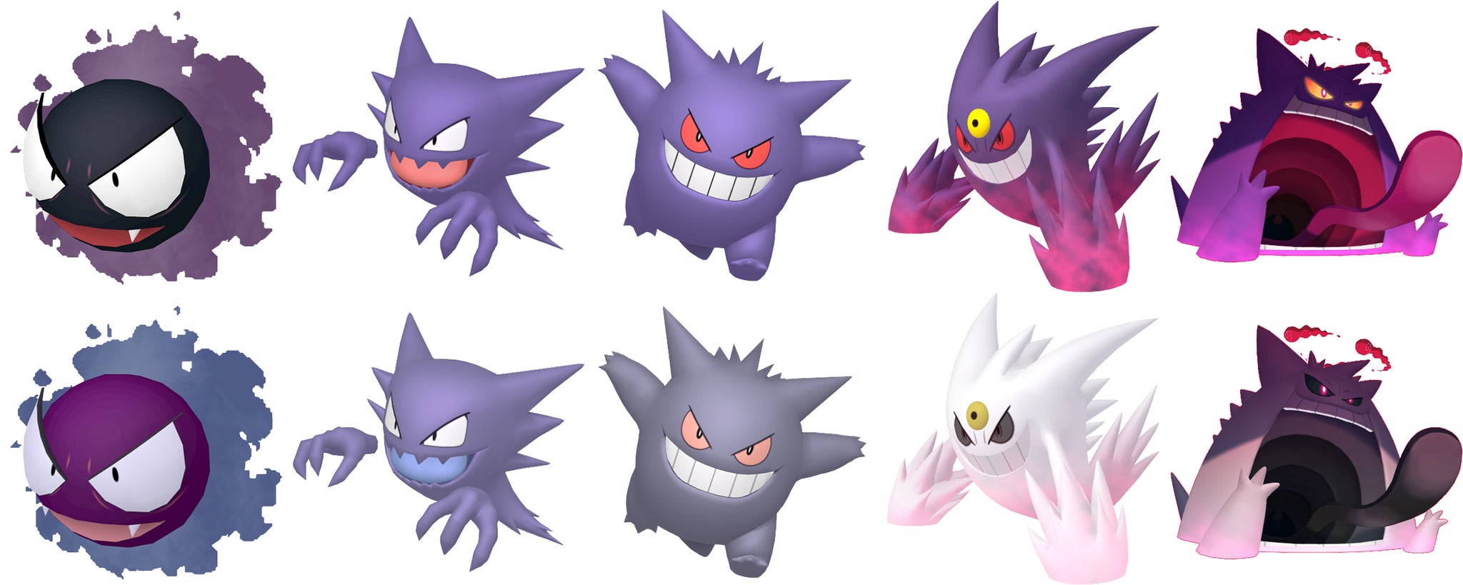 The ghostly entity’s shimmering form undergoes subtle chromatic shifts rather than dramatic transformations. Its spectral mist adopts deeper hues while its corporeal elements lighten – changes more noticeable upon evolution. While standard Gengar maintains dark tones, its mega-evolved counterpart displays striking alabaster pigmentation with crimson accents when Gigantamaxed.