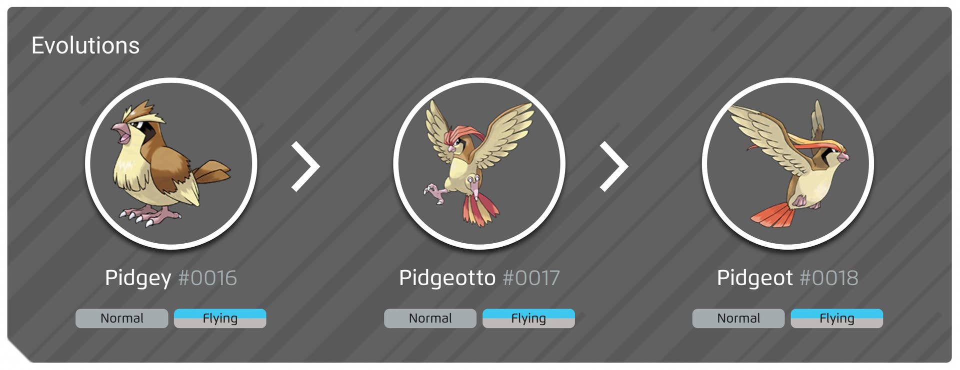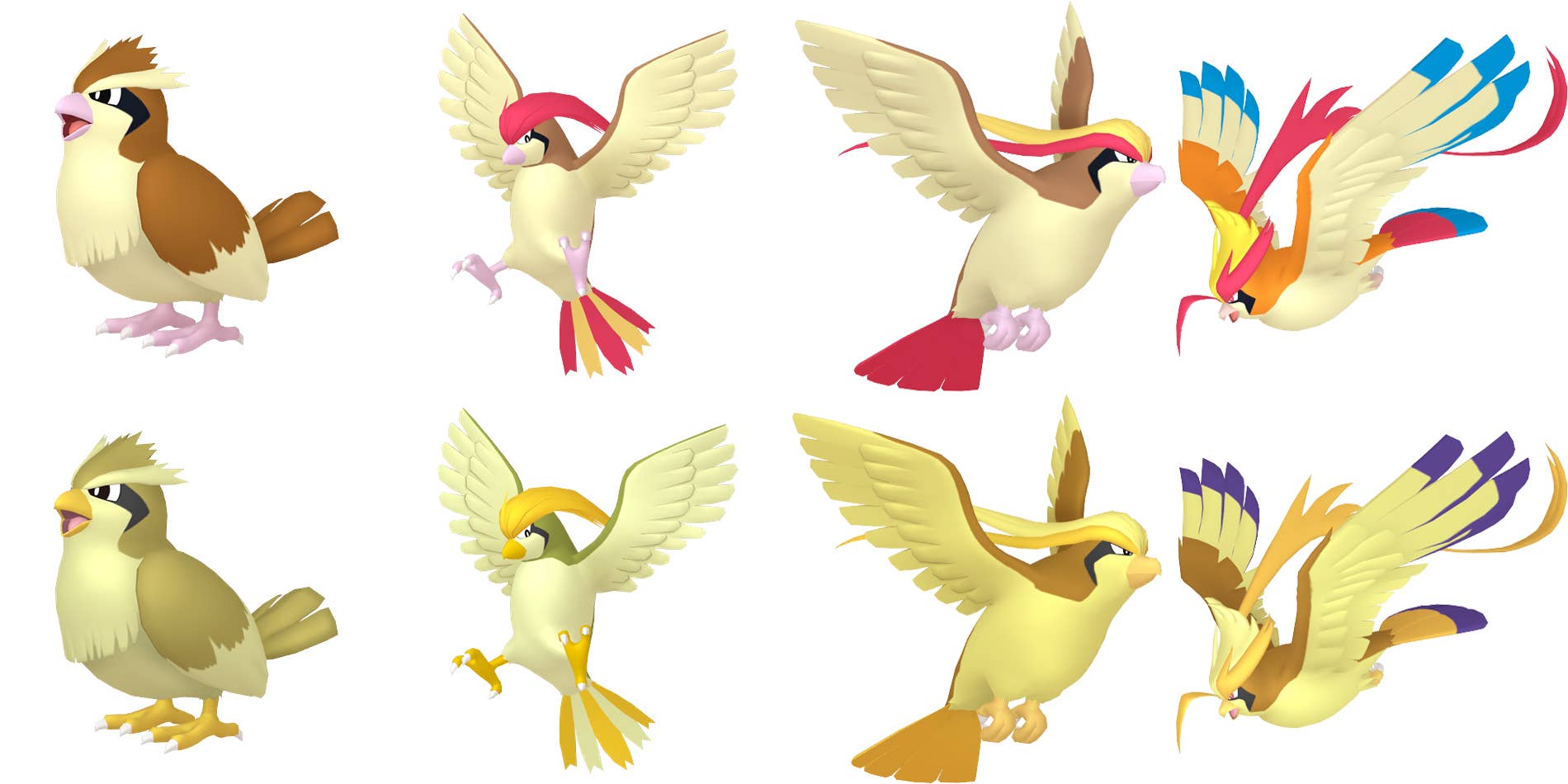Subsequent evolutions intensify these color shifts without dramatic transformation. Pidgeotto displays gilded feather patterns replacing crimson markings, with Pidgeot maintaining similar golden accents. Only its Mega Evolution introduces notable alteration through deep violet wingtips contrasting with neutral plumage.